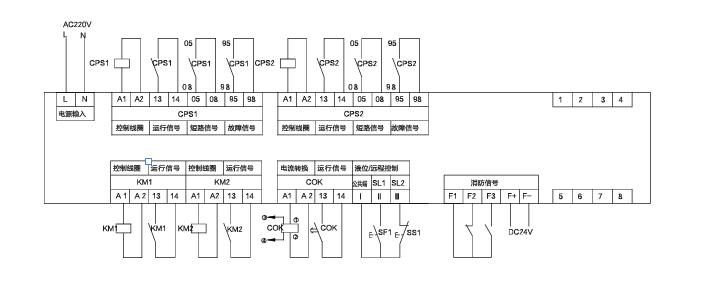 新式的端子接線方式:在控制與保護模塊上直接標明輸入的信號端子號,例如:CPS1 A1.A2;CPS1 05.08等。無需對線號進行編制或?qū)φ赵韴D出接線圖,簡單快捷,不會出現(xiàn)人為的接線故障。如果在是使用過程中出現(xiàn)故障后,可根據(jù)操作顯示器的故障原因?qū)φ障鄳慕泳€端子排查故障即可。